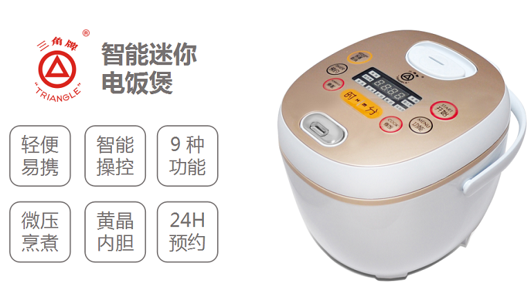 “三角”牌始于1963年,主要生产电饭锅,远销东南亚,久负盛名。50年来, “三角”牌凭借经典工艺、不懈创新,一直致力于为消费者提供可靠、实惠的电器产品,从最初的电饭锅延伸至所有厨房家电及其他生活电器,从只出口海外,到畅销国内。时至今日,“三角”牌产品覆盖从电饭锅等小家电到冰箱洗衣机等大家电,年产销量超1000万台,部分产品全国市场销量稳居前列,成为中国驰名商标、广州市著名商标、广州老字号。