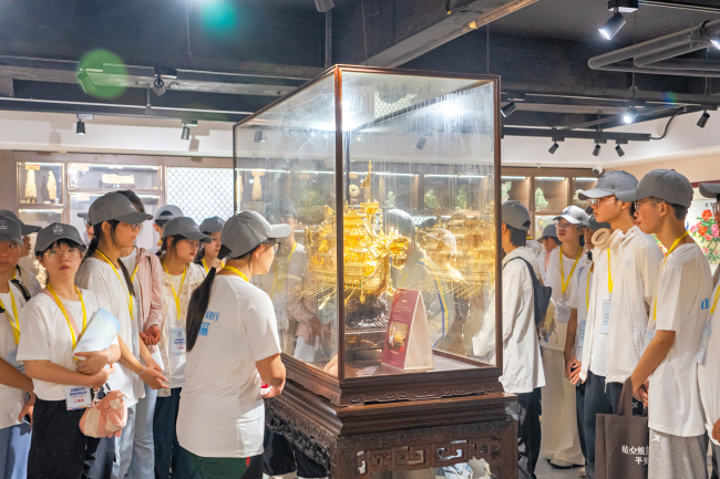 作为广东民间工艺博物馆(陈家祠)文创天地的运营方,大新公司充分挖掘陈家祠深厚文脉,为研学团量身定制沉浸式场馆参访路线。粤黔青少年们漫步古建,领略岭南建筑瑰宝,并走进陈家祠文创展区观赏传统符号与当代美学的创意结合。在带领下,粤黔台青年参观了大新公司企业文化展厅,系统了解“三雕一彩一绣”的发展脉络与传承成果,实现“历史遗产-现代文创-产业应用”特色联动,有效拓宽了文化传播的维度,助力青年在古今对话中迸发思考,感悟羊城史韵与创造活力。